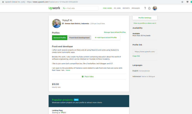 Nah dihalaman ini profil kamu bisa dilihat oleh freelancer lain dan pencari freelancer. Beberapa hal yang diisikan antara lain, nama lengkap asli, keterangan lengkap tentang spesialifikasi kamu, portofolio (lebih bagus jika dilengkapi dengan cerita singkat, screenshoot dan link yang mendukung), bayar per jam (dalam USD) dan skills.