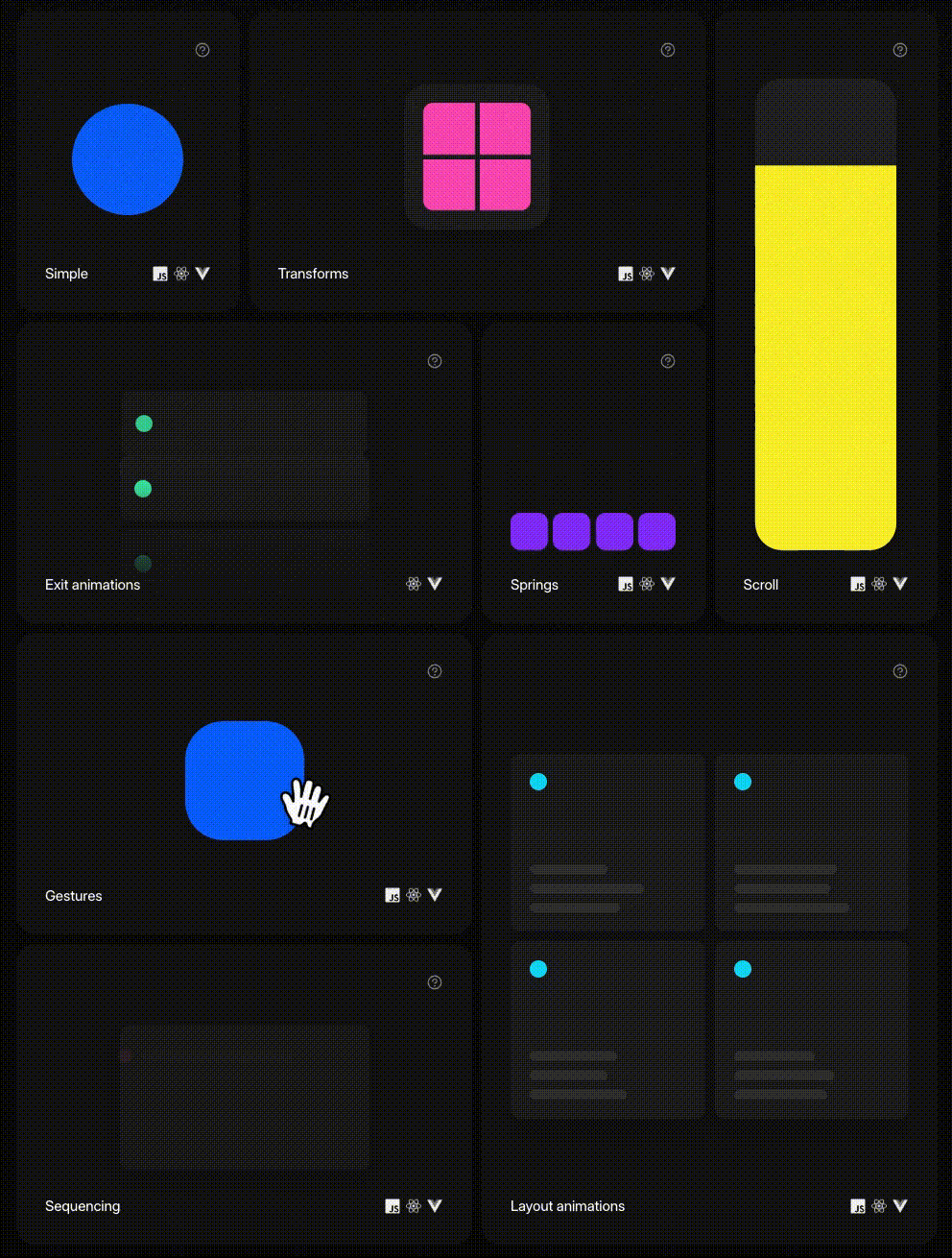 Hal penting lainnya adalah pergeraakan atau transisi, Motion.dev memberikan banyak opsi animasi yang bisa di pasangkan ke component yang membutuhkan, dan semua juga bisa dipisah-pisah berdasarkan pembagian waktu rendering, atau trigger manual dari user.